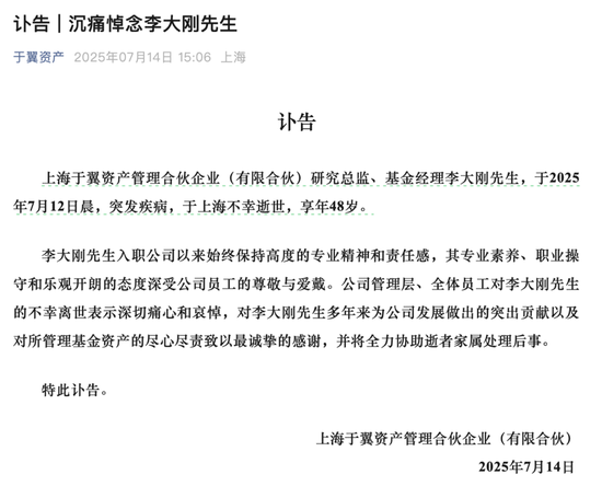 7月14日下午,沪上知名证券私募上海于翼资产管理合伙企业(有限合伙)(以下简称于翼资产)发布了一则讣告,该公司研究总监、基金经理李大刚于7月12日晨突发疾病,于上海不幸逝世,享年48岁。