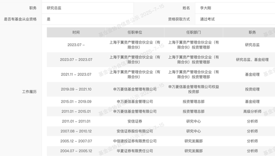 公开资料显示,李大刚2004年起从事金融相关工作,曾任职于中信建投证券研究所、安信证券研究所,担任分析师;2011年1月加入申万菱信基金,曾任行业研究员、节能环保研究组组长等职务,2015年开始担任基金经理,管理公募基金产品,在申万菱信基金工作长达10年时间。2021年11月,李大刚加入于翼资产,担任基金经理,后来成为研究总监。